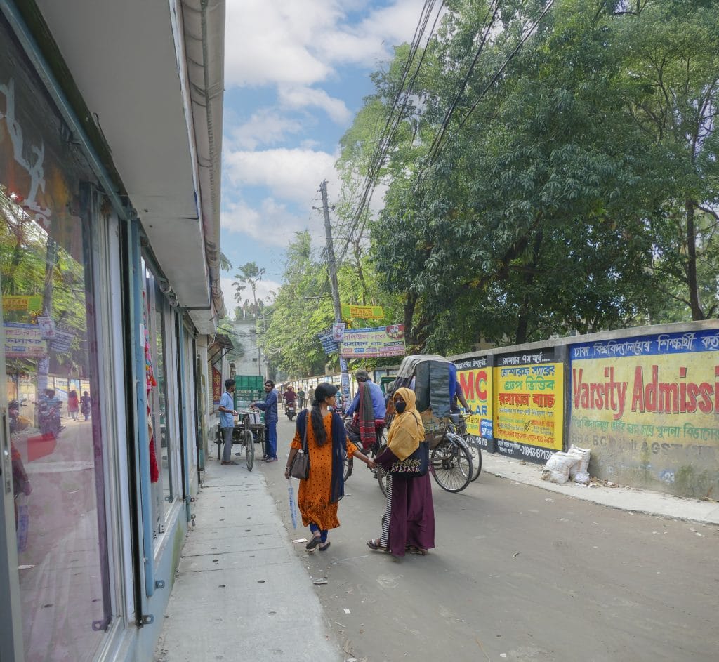 Met een uitnodigende lach staat ze achter de toonbank als tien Nederlanders haar winkel binnenlopen. Achter haar reiken de kasten tot aan het plafond. Ze bieden plek aan de grote hoeveelheid traditionele sari’s die ze zelf heeft gemaakt. Haar uitstraling onthult dat ze goed in haar vak is. Een blauwe sari, een trendy bril en een paar zilveren sieraden maken de 41-jarige Madina tot een echte stijlicoon.